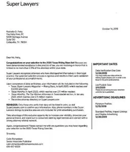 Super Lawyers has included Rashelle Fetty on their 2020 Texas Rising Stars list. An honor that is only awarded to the state’s top 2.5% attorneys.